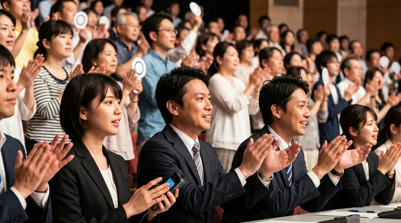 拍手メーター審査では全力の拍手を、声量審査ではコール・歓声を、挙手投票では全員一斉に挙手。審査形式を問わず最適な対応を行います。