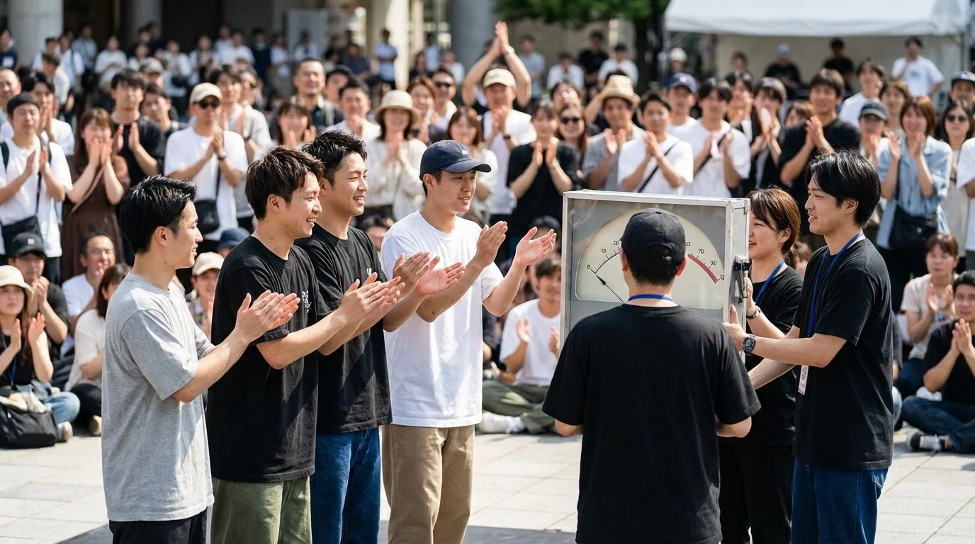 拍手メーターの数値が、あなたのパフォーマンスの評価を決める——動員力の差が実力以上に結果を左右する現実。 ストリートダンス・バレエ・チアダンス・カラオケ・マジックなどあらゆるパフォーマンスコンテストに、ジャンルの雰囲気を理解した応援団を手配。拍手メーター・声量審査・投票用紙・アプリ投票など全ての形式に、事前打ち合わせ済みの的確なタイミングで対応し、あなたの優勝を全力で応援します。秘密厳守・全国対応。