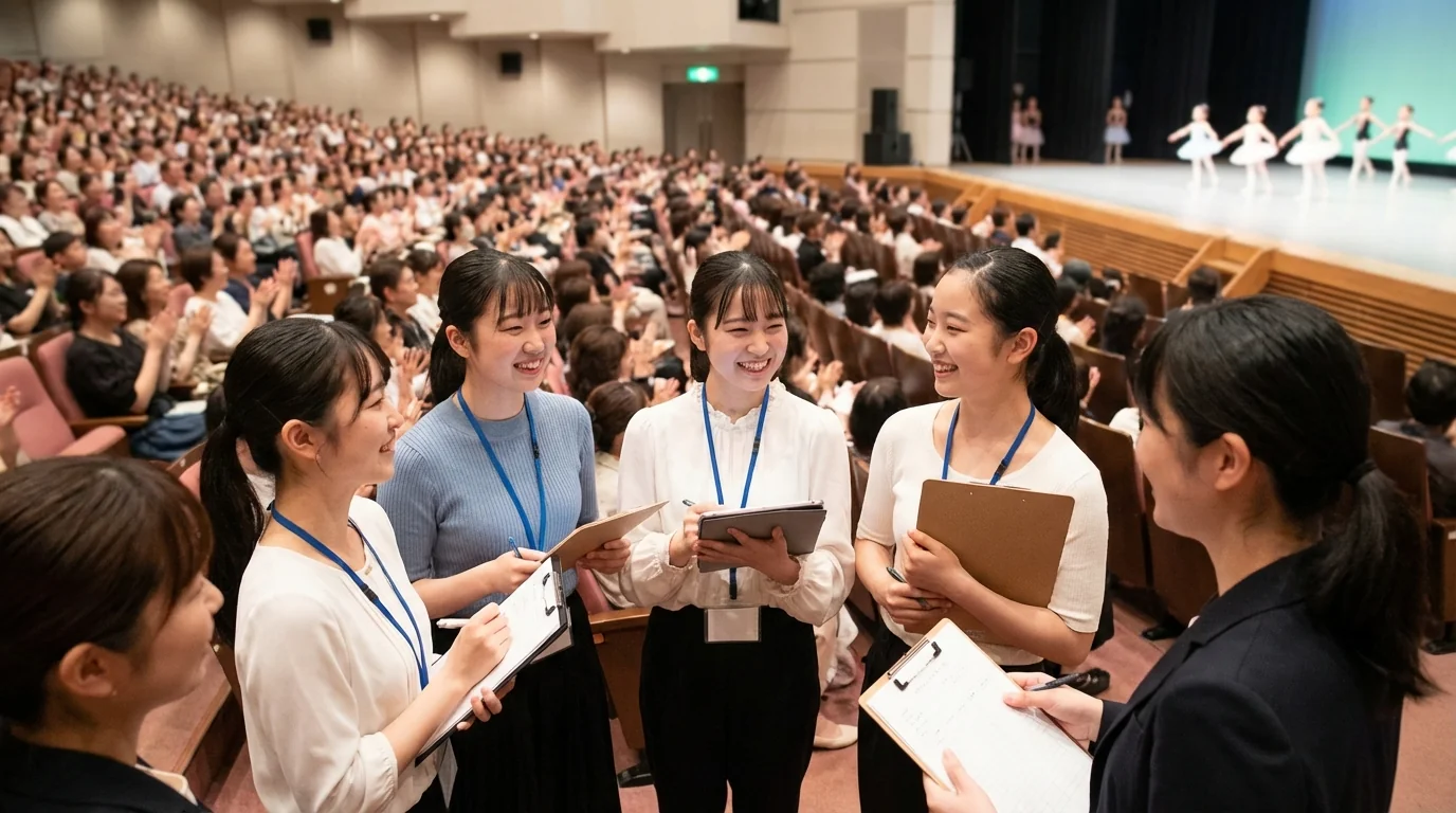 ジュニアバレエコンクールで観客の反応(拍手の量・会場の雰囲気)が審査員の総合評価に影響するとのこと。大手バレエスクールの生徒は保護者ネットワークで大量に動員していましたが、個人教室のため動員が限定的。当社から上品な雰囲気の女性スタッフ10名を手配し、バレエの観劇マナーを理解した静かな応援と、演技終了後の温かい拍手で支援しました。