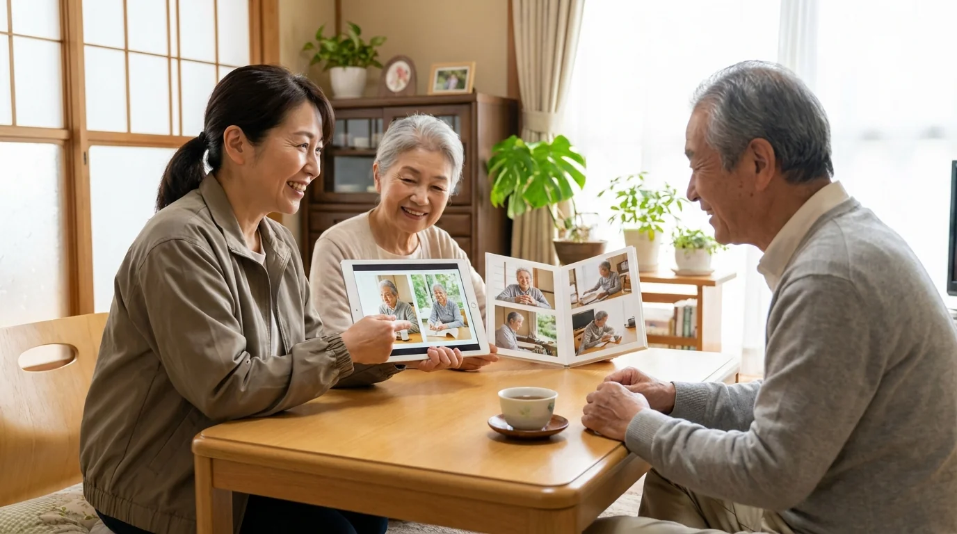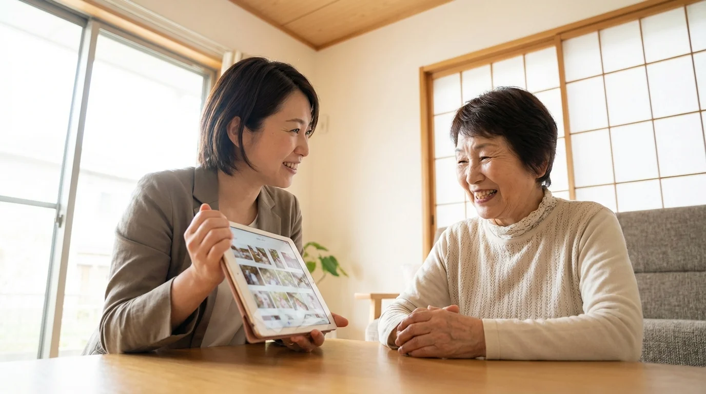 訪問のたびにご家族へ写真付きの報告をお送りします。お元気そうな表情、お部屋の様子、冷蔵庫の中身まで——離れていても目で確認できる安心を、追加料金なしでお届けします。