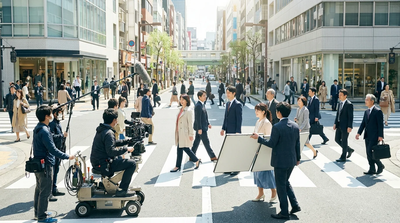 撮影するシーンの時間帯や曜日の設定に合わせたリアルな通行人を手配。平日朝のビジネス街、休日の繁華街など、本来あるべき風景を正確に再現し、主演の演技やカメラワークに合わせた精密なタイミング制御も行います。
