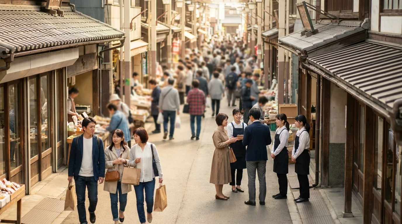 昔ながらの商店街の雰囲気に合わせ、買い物袋を持った主婦、自転車を押す高齢者、食べ歩きをするカップルなど、多様な通行人を20名手配。各自が異なる動線で自然に行き交う活気ある風景を作り上げました。