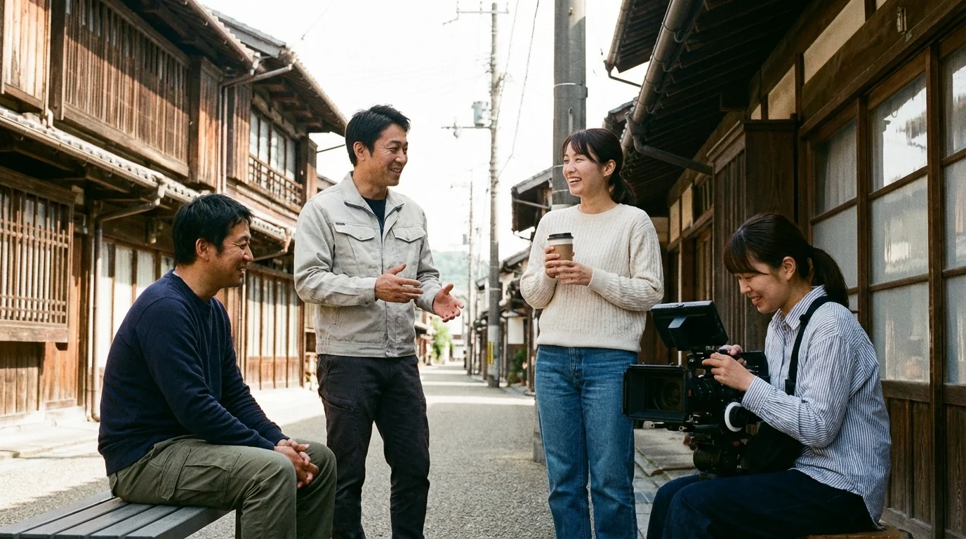 少人数でも効果的に街の賑わいを演出できるよう、歩行動線や服装、歩く速度を細かく工夫。5名程度の通行人エキストラでも活気ある街の雰囲気を作り出し、限られた予算でも高い映像効果を実現します。