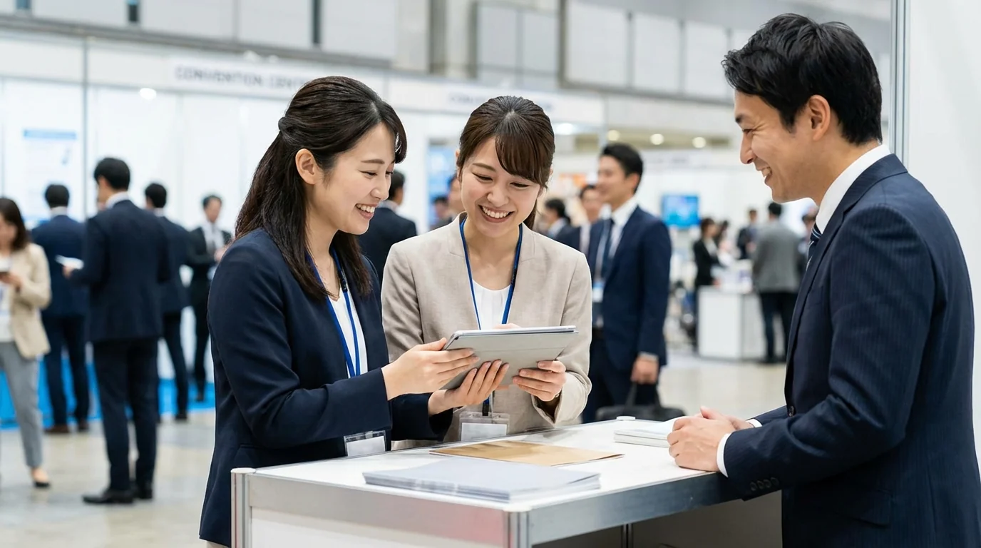 スーツ着用のスタッフが展示会ブースに常駐し、来客の出迎え・名刺受け取り・資料配布・アンケート回収を担当。お客様はプレゼンや商談に集中いただけます。複数名の手配にも対応し、大規模イベントもカバーします。秘密厳守で安心です。