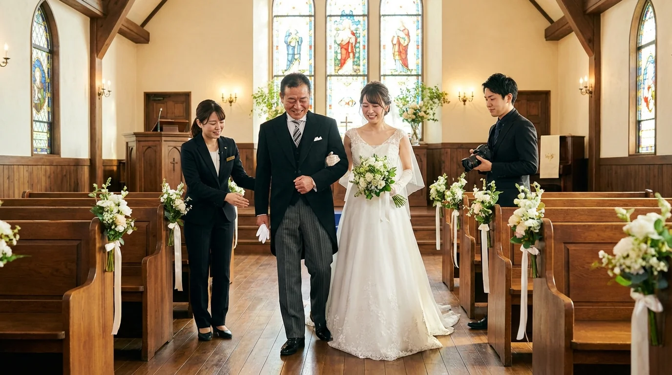 60代前後の温かみのある男性スタッフが父親役としてバージンロードを一緒に歩きます。歩くペース・腕の組み方・新郎への手の渡し方まで事前にリハーサル。花嫁の夢を叶え、会場全体を感動で包む特別な瞬間をお約束します。秘密厳守で安心です。