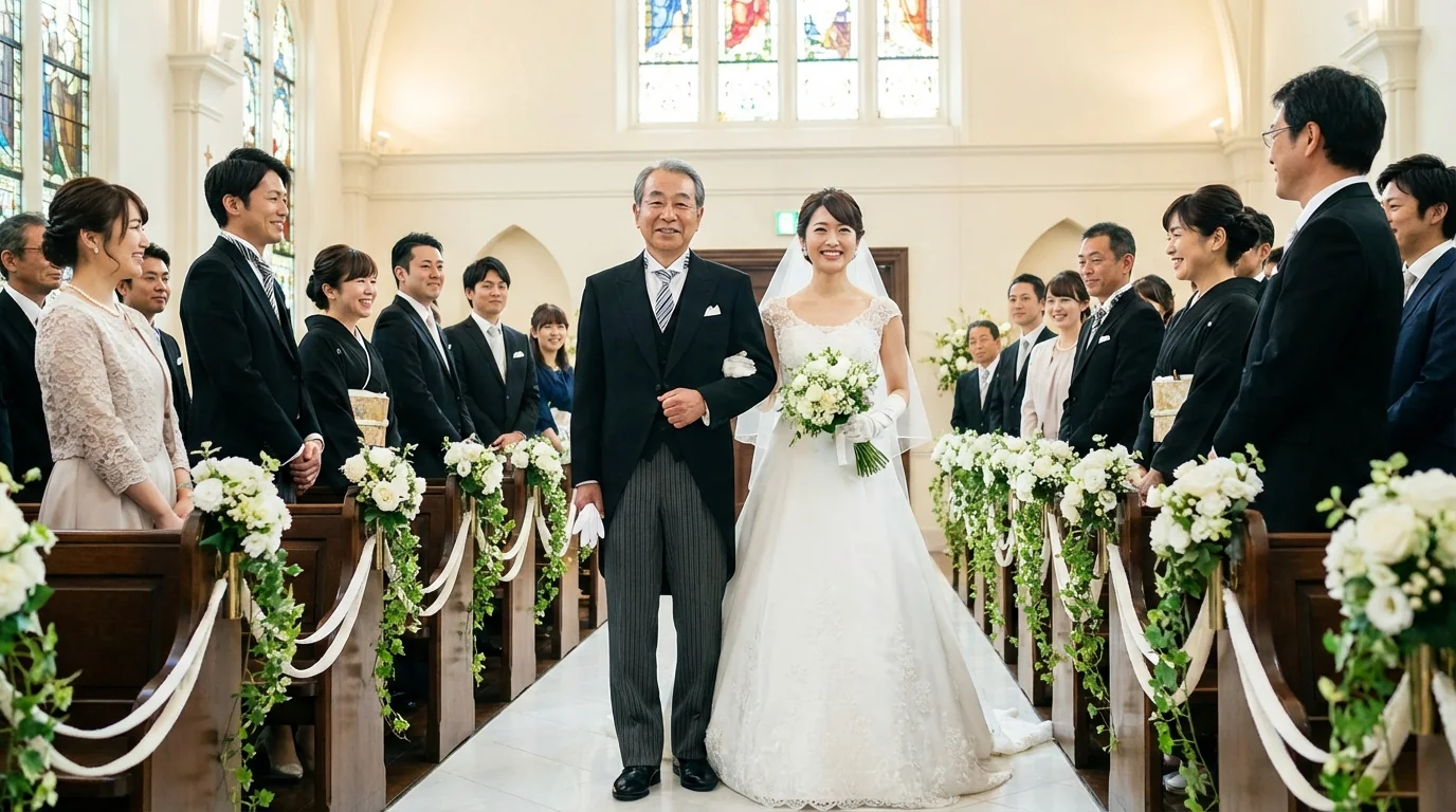 幼い頃に父を亡くし、バージンロードを一緒に歩いてくれる人がいない状況でした。60代男性スタッフを父親役として手配。事前に3回の打ち合わせで父娘のエピソードや歩くペース・手の握り方まで丁寧に準備。挙式当日、バージンロードでしっかりと腕を組み、新郎に手を渡す瞬間は会場中が感動に包まれました。