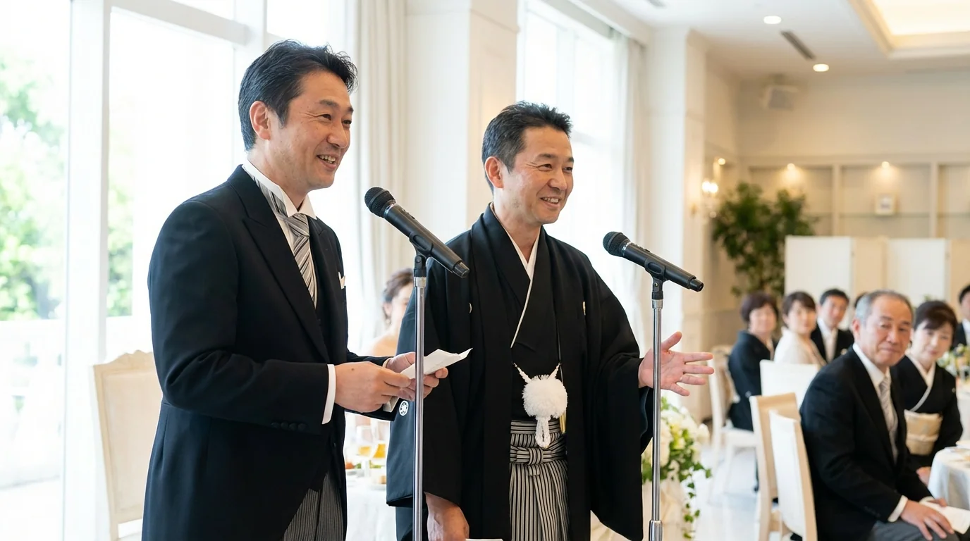 父親役として両家代表挨拶を格調高く務めます。新郎新婦の成長への感謝・ゲストへのお礼・将来への祝福を込めた温かいスピーチを事前に準備。原稿は確認いただけます。披露宴の締めくくりにふさわしい感動的な挨拶をお届けします。