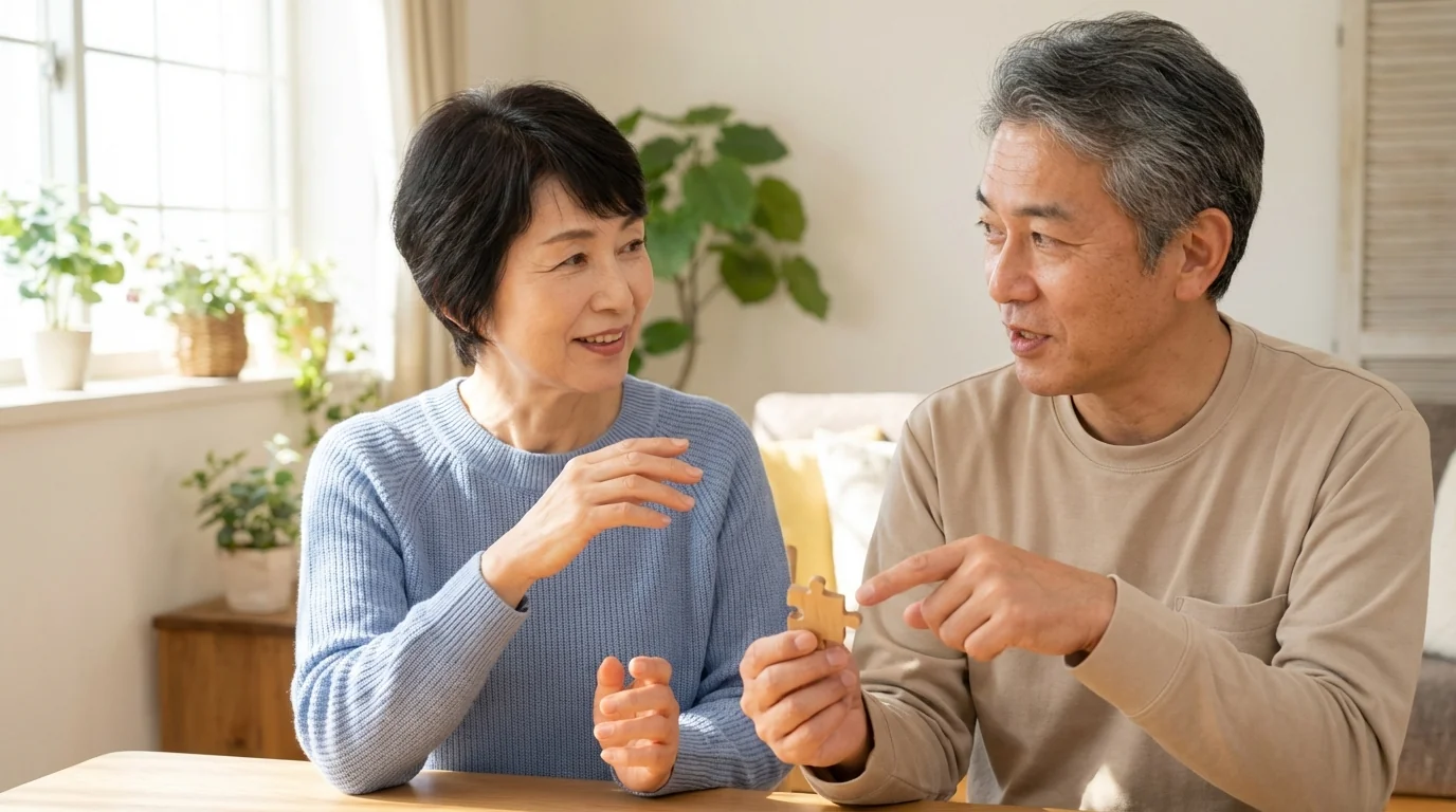 会話は脳の活性化に効果的です。思い出を語る回想法、時事ニュースの話題、しりとりやクイズなど、楽しみながら脳を刺激する会話を心がけます。